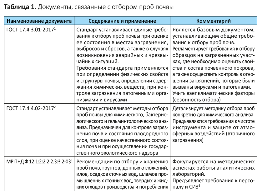 Методология, по которой следует проводить отбор проб почвы с целью химического, бактериологического и гельминтологического анализа, установлена документами, указанными в табл. 1.