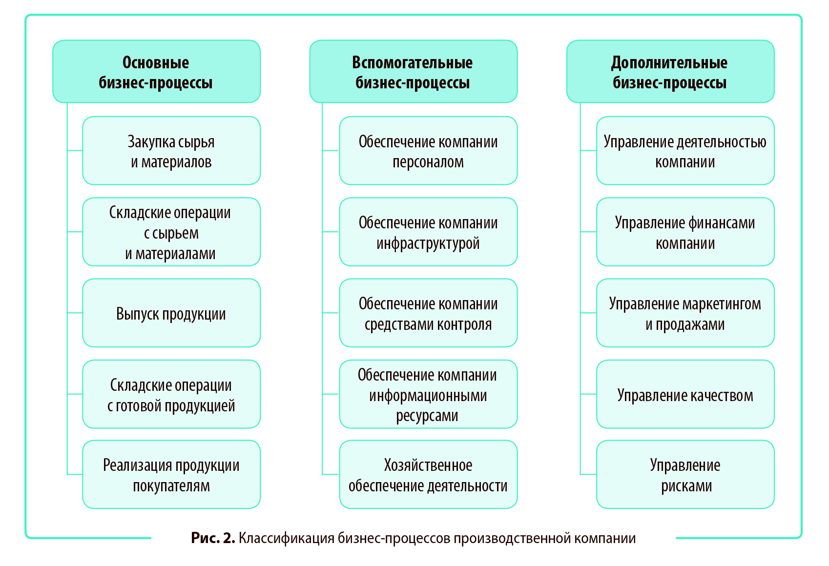 3) дополнительные процессы — позволяют управлять деятельностью компании, то есть определять цели и задачи развития, контролировать их выполнение и реализовывать управленческие решения по оптимизации работы предприятия.