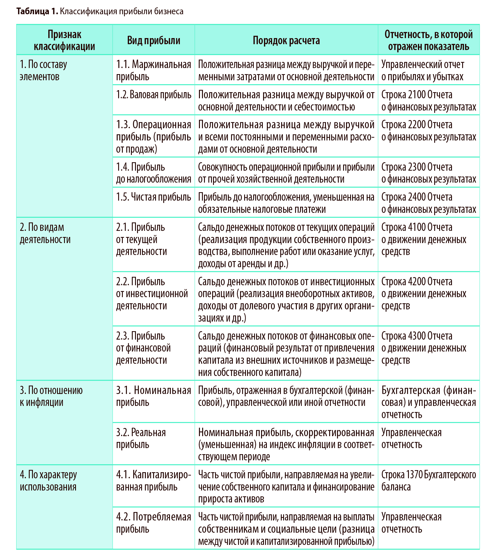 В таблице 1 представлена классификация различных видов прибыли.
