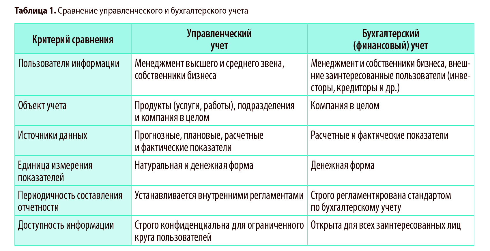 Управленческий учет имеет специфические отличия от системы бухгалтерского (финансового) учета. Сравнить управленческий и бухгалтерский учет по пяти критериям можно по таблице 1.