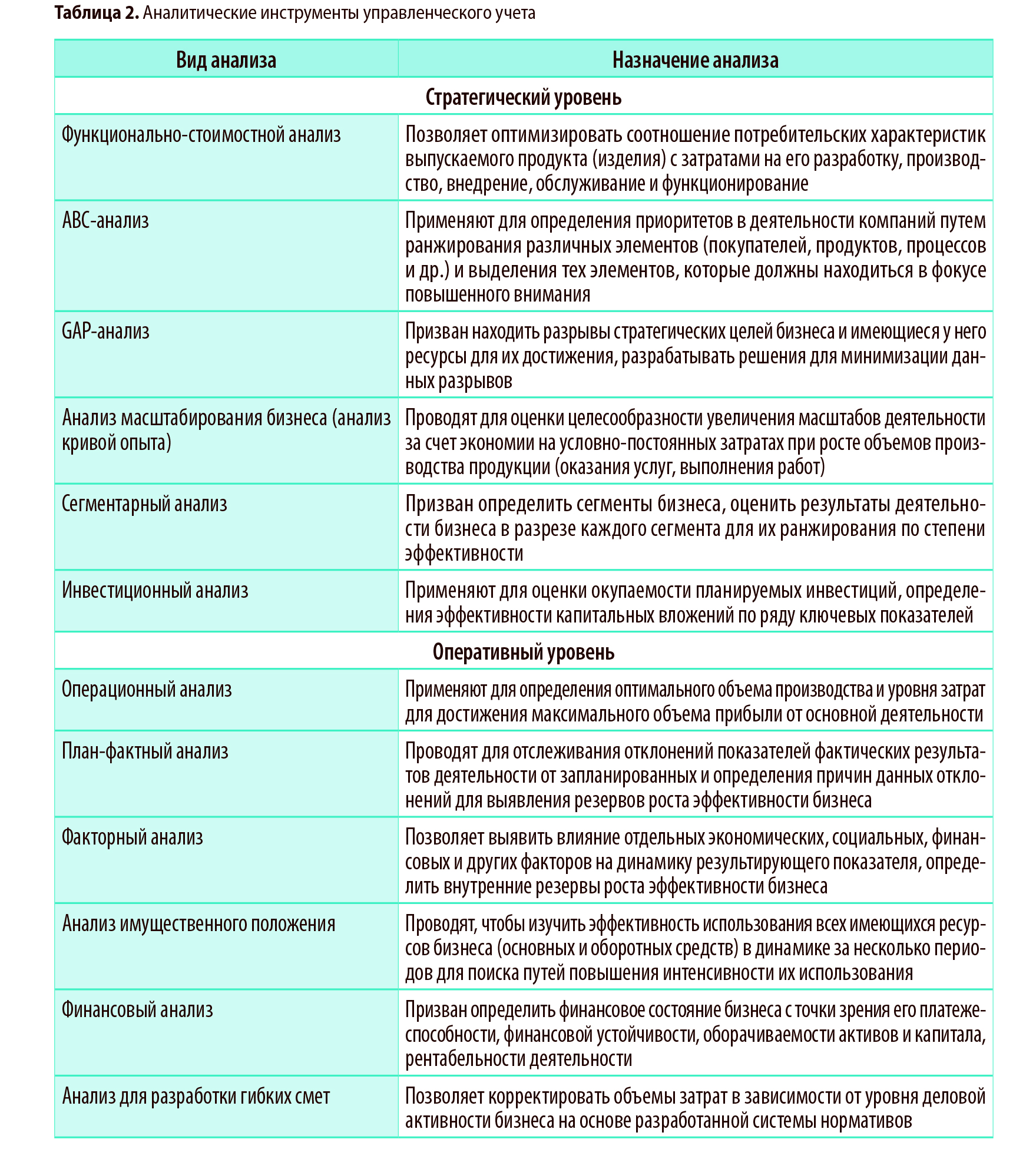 В таблице 2 представлены основные виды экономического анализа, используемые в управленческом учете.