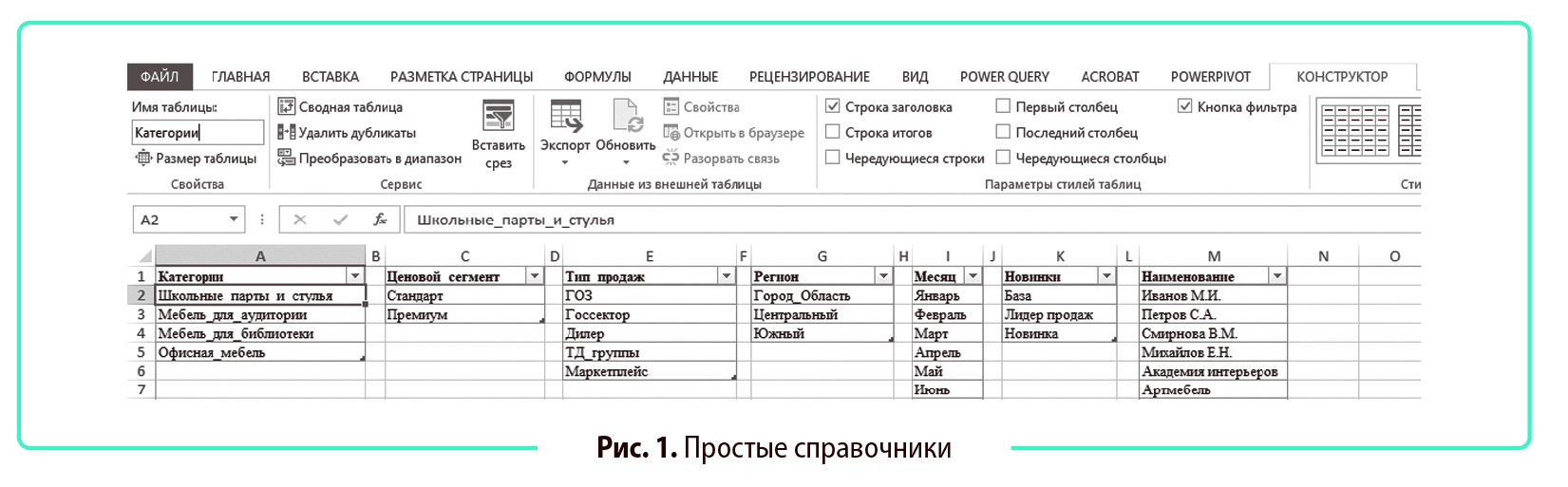 Как правило, проектируют справочники «Категории», «Ценовой сегмент», «Тип продаж», «Регион» и т. д. Все справочники форматируют как таблицы: вкладка Главная → Стили → Форматировать как таблицу. Далее переходят на вкладку Конструктор → Свойства и указывают имя таблицы (например, «Категории»).