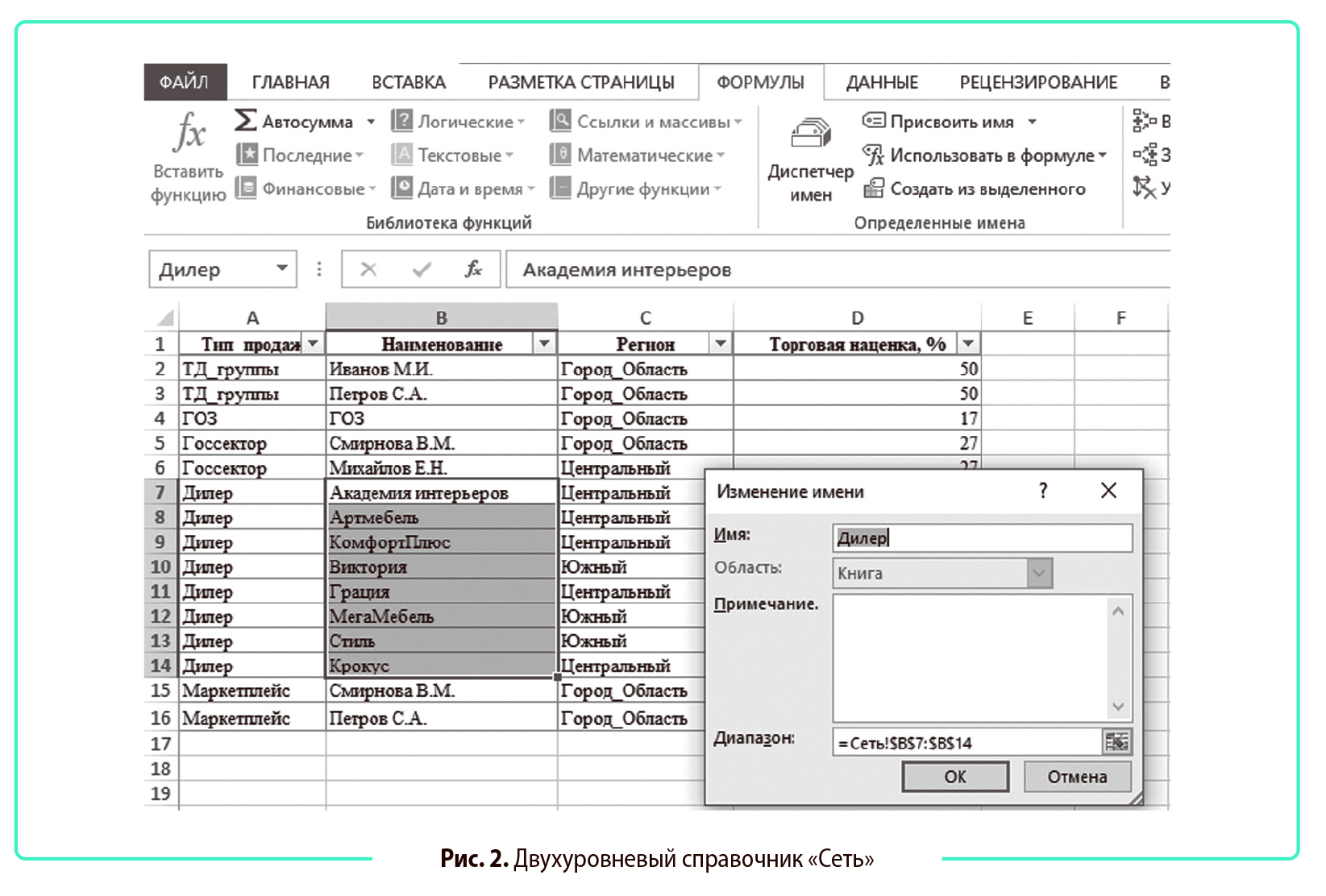 Чтобы при указании типа продаж «Дилер» открывался справочник дилерской сети, задают поименованный диапазон: вкладка Формулы → Определенные имена → Присвоить имя. Заданному диапазону присваивают в качестве имени тип продаж, как в столбце А на рис. 2 (Дилер, ГОЗ и т. д.). Увидеть уже присвоенные имена можно в «Диспетчере имен» во вкладке «Формулы».