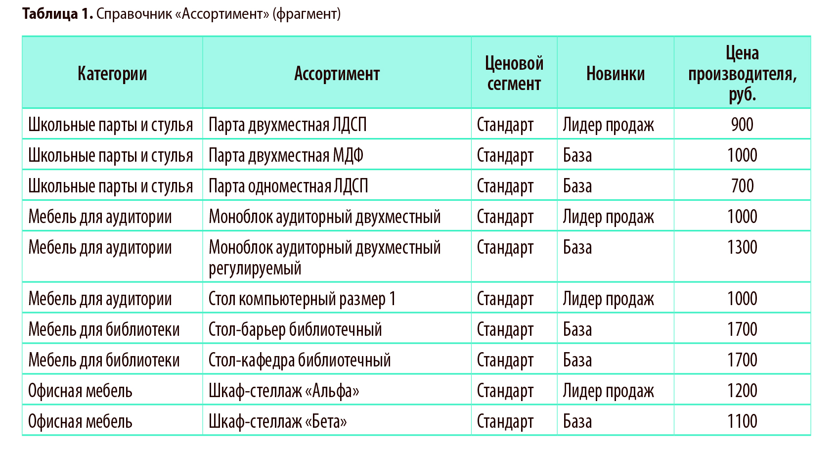 В таблице 1 для каждой позиции ассортимента обозначено, к какому ценовому сегменту она относится, является ли новинкой.
