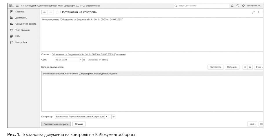 Постановка документов и поручений на контроль. Документы ставятся на контроль автоматически, если в локальном нормативном акте предусмотрен контроль для этого вида документа, либо в индивидуальном порядке, если требование контроля содержится в резолюции руководителя (рис. 1). При этом определяется конкретный контролер.