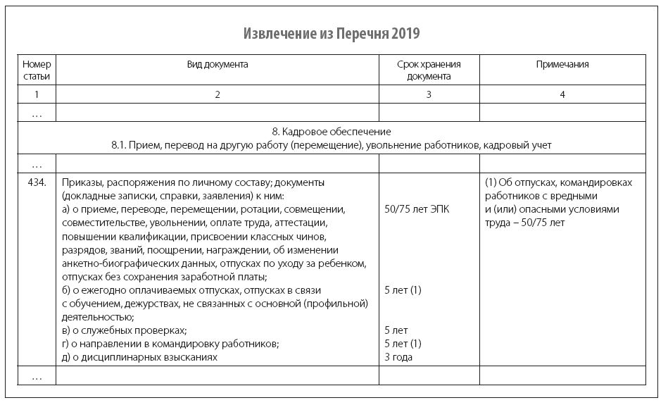 Приказам по личному составу посвящена ст. 434 Перечня 2019. Она довольно объемна, но в ней, к сожалению, приведен неисчерпывающий список тем для приказов по рассматриваемой нами тематике. Подробнее об этом поговорим далее.